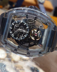 360度全透明殼:採用全水晶玻璃打造的酒桶形錶殼,視覺上毫無遮擋,讓機芯如同「懸浮」在手腕上。