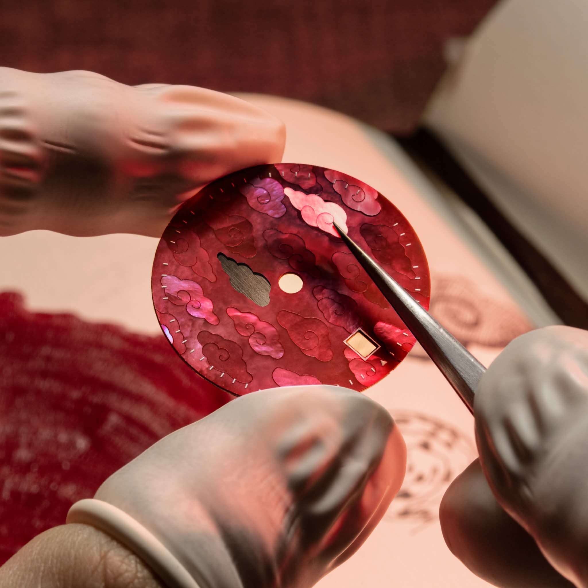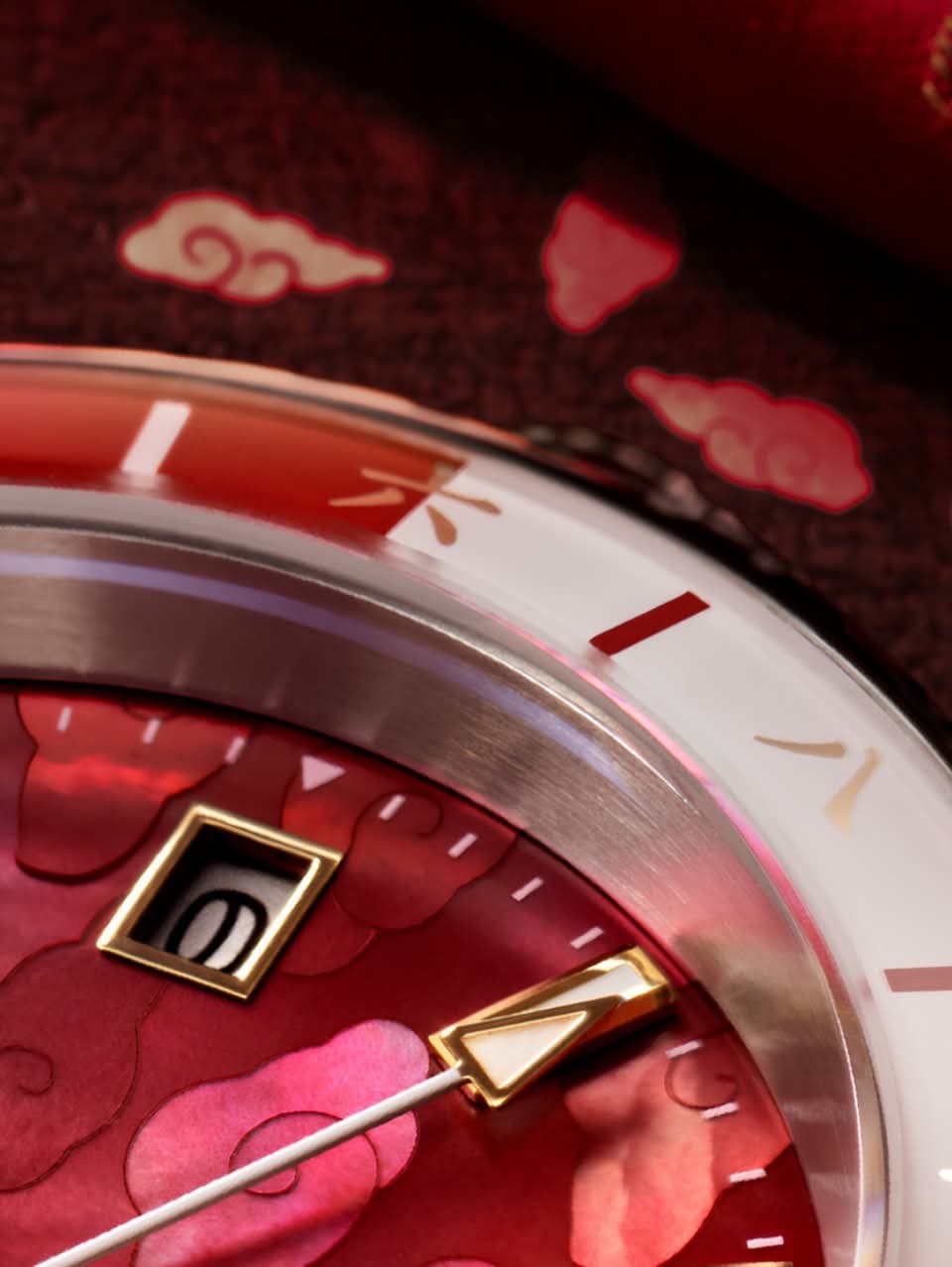 錶面採用手工鑲嵌的紅色馬賽克珍珠母貝製成傳統雲紋的圖案,寓意吉祥如意。金色中國數字GMT圈盡顯東方韻味。而精雕細琢的錶背,上面刻著秦始皇兵馬俑和古字「鎬」(即西安古稱),蘊藏著深厚的歷史底蘊。