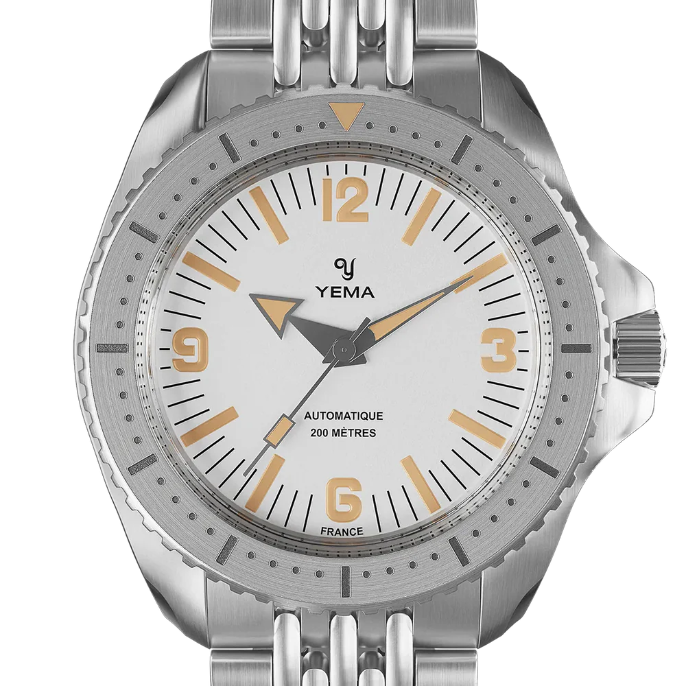 YEMA Diver 的靈感來自50 年代末至60 年代初的復古潛水錶,採用經典、堅固的設計,並帶有一些獨特的元素,如皮膚潛水員錶盤、寬箭頭指針、Monnin 風格的錶殼和雙圓頂亞克力水晶增添了整體復古美感。 錶徑: 39.5 mm 錶厚: 11.7 mm 機芯: SW200自動上鏈機芯 錶殼: 精鋼 錶鏡: double dome hesalite crystal 防水: 200米防水 動力儲備: 42小時